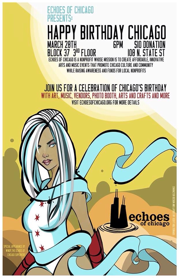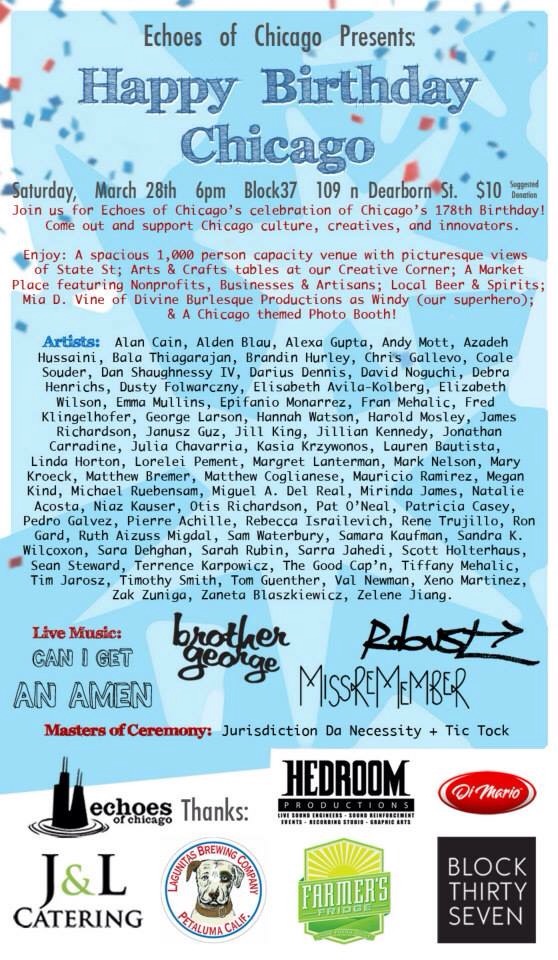 This weekend Echoes of Chicago will be hosting their annual ‘Happy Birthday Chicago’ event at Block 37, downtown. Please come and support this great organization and the great line-up of Artists and Performers! Also, yours truly has a new painting displayed in the show! Echoes of Chicago throws these great events to raise funds for area non-profits doing wonderful things all over Chicago!